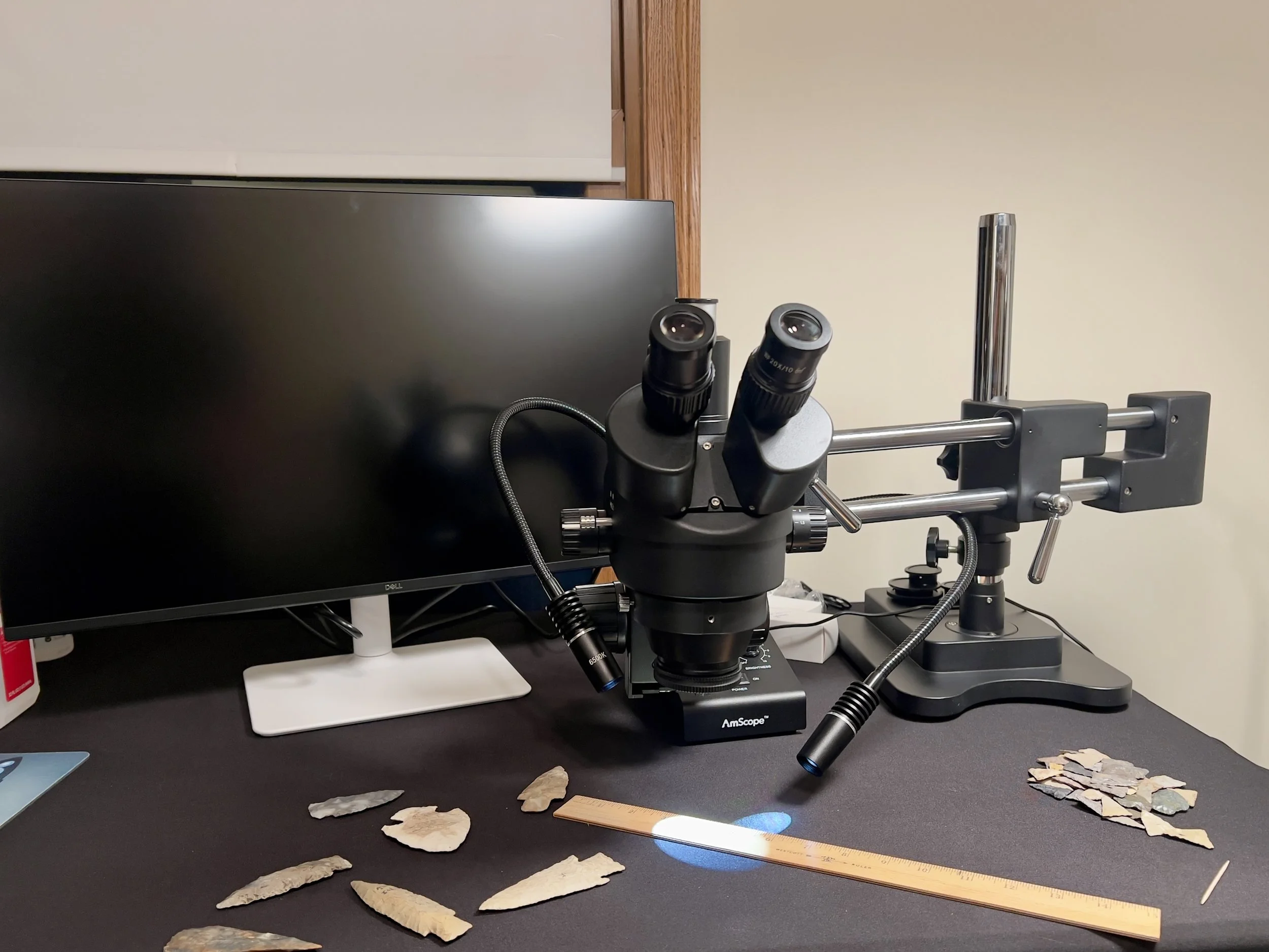 A trinocular AmScope SM-4TZZ-B stereo zoom microscope on an adjustable boom arm with dual gooseneck lighting and a camera feeding live view to a Dell monitor. The setup allows safe handling, directional lighting, and real-time documentation during artifact evaluation.